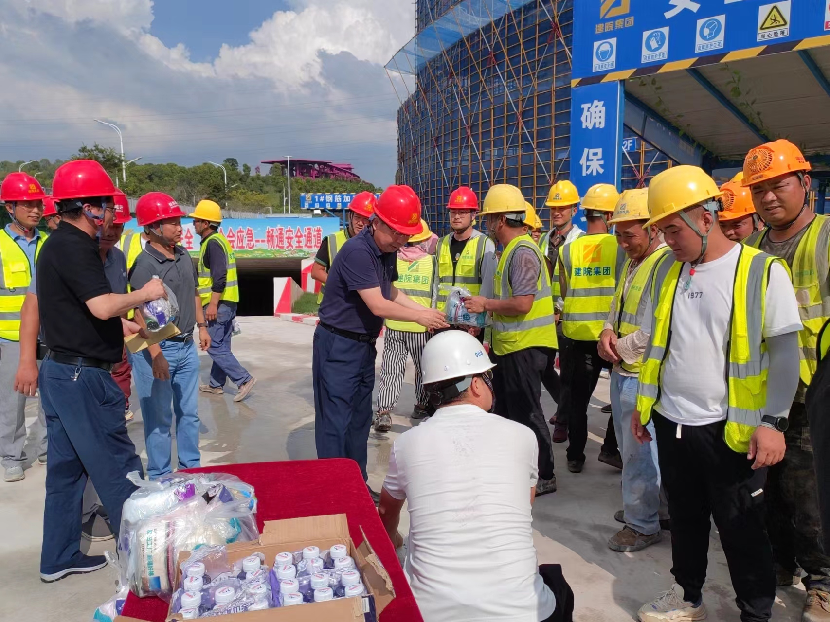 炎炎夏日送清涼,絲絲關懷暖人心。持續(xù)高溫悶熱天氣,給堅守一線的職工帶來了嚴峻“烤”驗。為切實做好抗高溫防暑降溫工作,有效防控高溫中暑事件和安全生產事故的發(fā)生,切實維護廣大職工的勞動安全和健康權益,按照市國控集團黨委、市國控集團工會的統(tǒng)一部署,7月25日-7月26日,集團黨委書記、董事長陳建功,黨委副書記、副董事長、總經(jīng)理劉冰,黨委委員、副總經(jīng)理翁暢等分別帶隊走訪慰問了建筑科創(chuàng)中心項目部、新二中站點、幸福河湖項目部、馬城糧庫,為堅守在一線的項目員工送上毛巾、香皂、清涼油等慰問品,對大家的辛苦付出表示感謝,對一線職工不畏高溫、堅守崗位、拼搏奉獻的精神表示贊揚,同時叮囑大家要努力克服高溫天氣帶來的困難和挑戰(zhàn),注意防暑降溫,做好自身防護,確保各項工作安全有序推進。