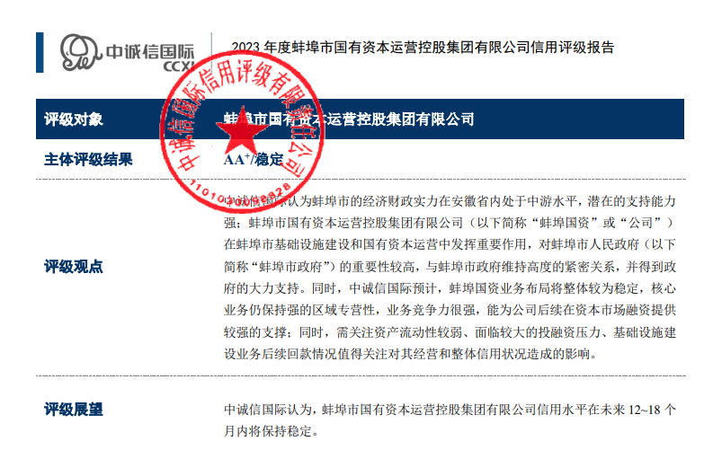 2023年9月4日,經(jīng)中誠信國際信用評級有限公司評定,蚌埠市國有資本運(yùn)營控股集團(tuán)有限公司再次成功獲評AA+主體信用評級,評級展望為穩(wěn)定,時(shí)效期為一年。這是蚌埠國控集團(tuán)繼2022年8月5日獲得東方金誠國際信用評估有限公司評定的AA+主體信用評級后,再次評為AA+級信用主體,實(shí)現(xiàn)了AA+主體信用“雙評級”。